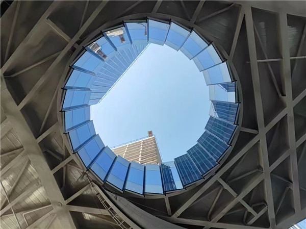 项目施工自启动以来,便面临场地限制严苛、施工条件复杂等挑战,但团队以精益求精的态度和严谨科学的管理,在七个月内完成1.38万吨钢结构安装;采用“即到即装”模式,确保材料运输与安装无缝对接;在空中连廊的钢拉杆节点设计上创新性地采用了Q620GJC-Z35高强钢材质。